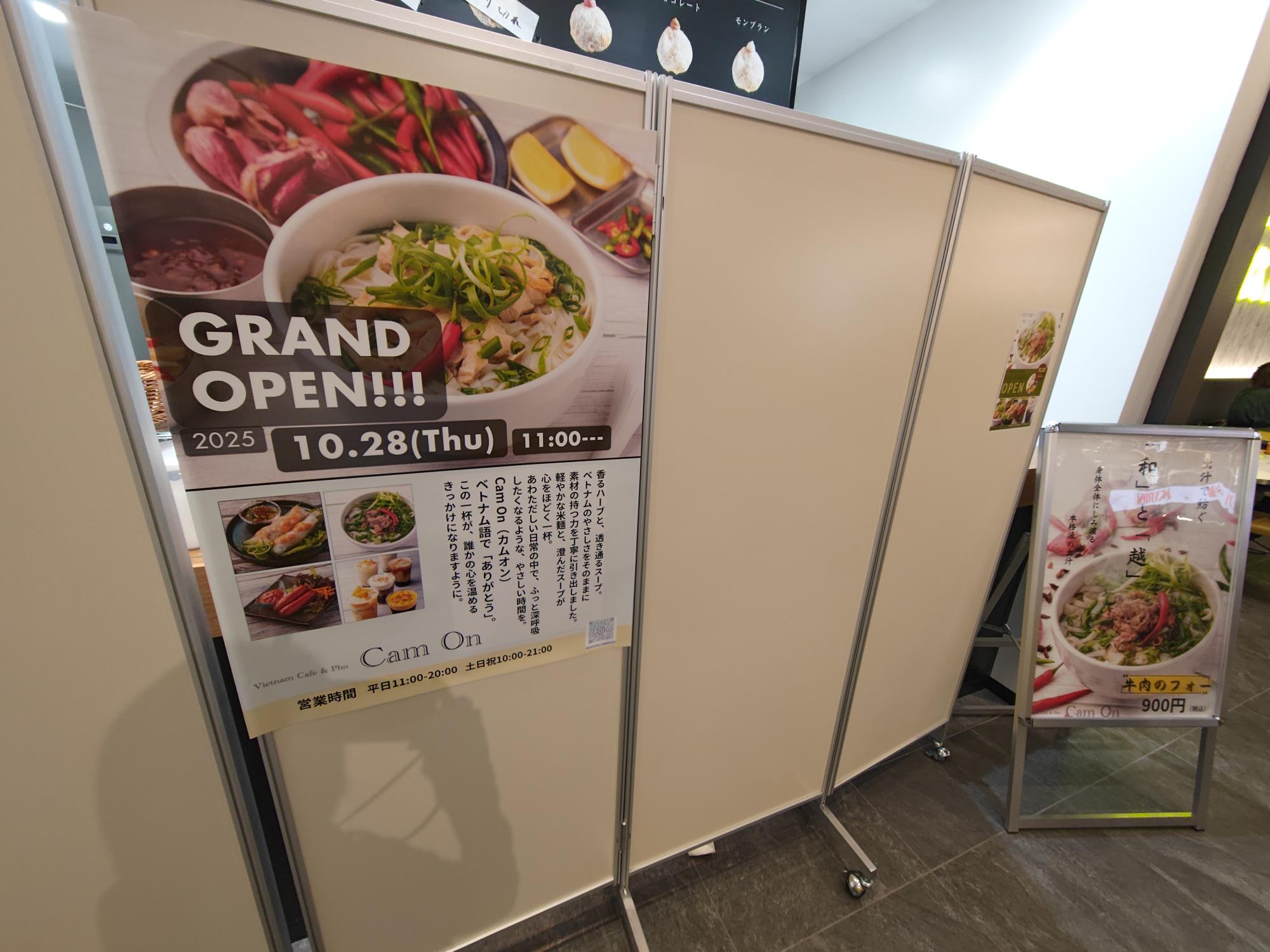 店舗前にはオープンのお知らせが貼ってありました。この記事がアップされる頃にはすでにオープンになっていると思われますが、2025年10月28日(火)にグランドオープンするのは、「Vietnam Cafe&Pho Cam on」という、本場ベトナム首都ハノイで愛されている本格的フォー、ベトナム式コーヒーやタピオカドリンクを販売するお店です。