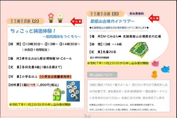 また、15日(土)のみ、16日(日)のみの開催のものもあります。15日(土)のみ、参加費無料の「古墳のしおりをつくろう!」、次は申し込みが必要ですが、「ちょこっと鋳造体験!」などが行われます。16日には「美原朝市」、「立礼式お茶席(有料)」、「堺緞通の織り体験!!」「黒姫山古墳ガイドツアー」など、たくさんの催しがあります。