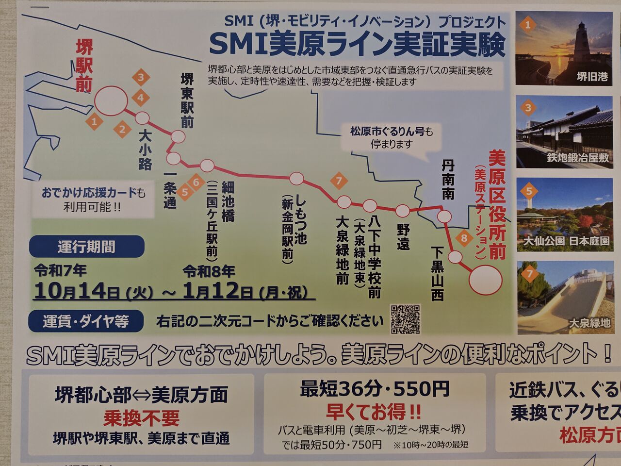 「SMI美原ライン」。堺都心部と美原を直通で繋いでくれるバス。堺の東西の移動がしやすくなり、便利で良いですね。なお、「関西を走るバス大集合―ミニチュアバス50台展」に行かれる際には、休館日もありますので、「M・Cみはら」のホームページをご確認ください。