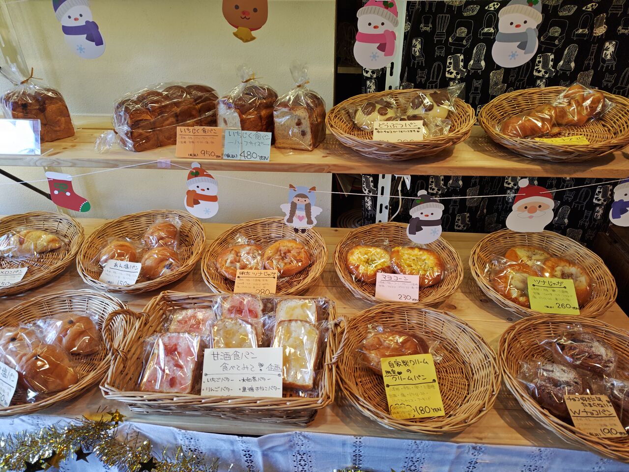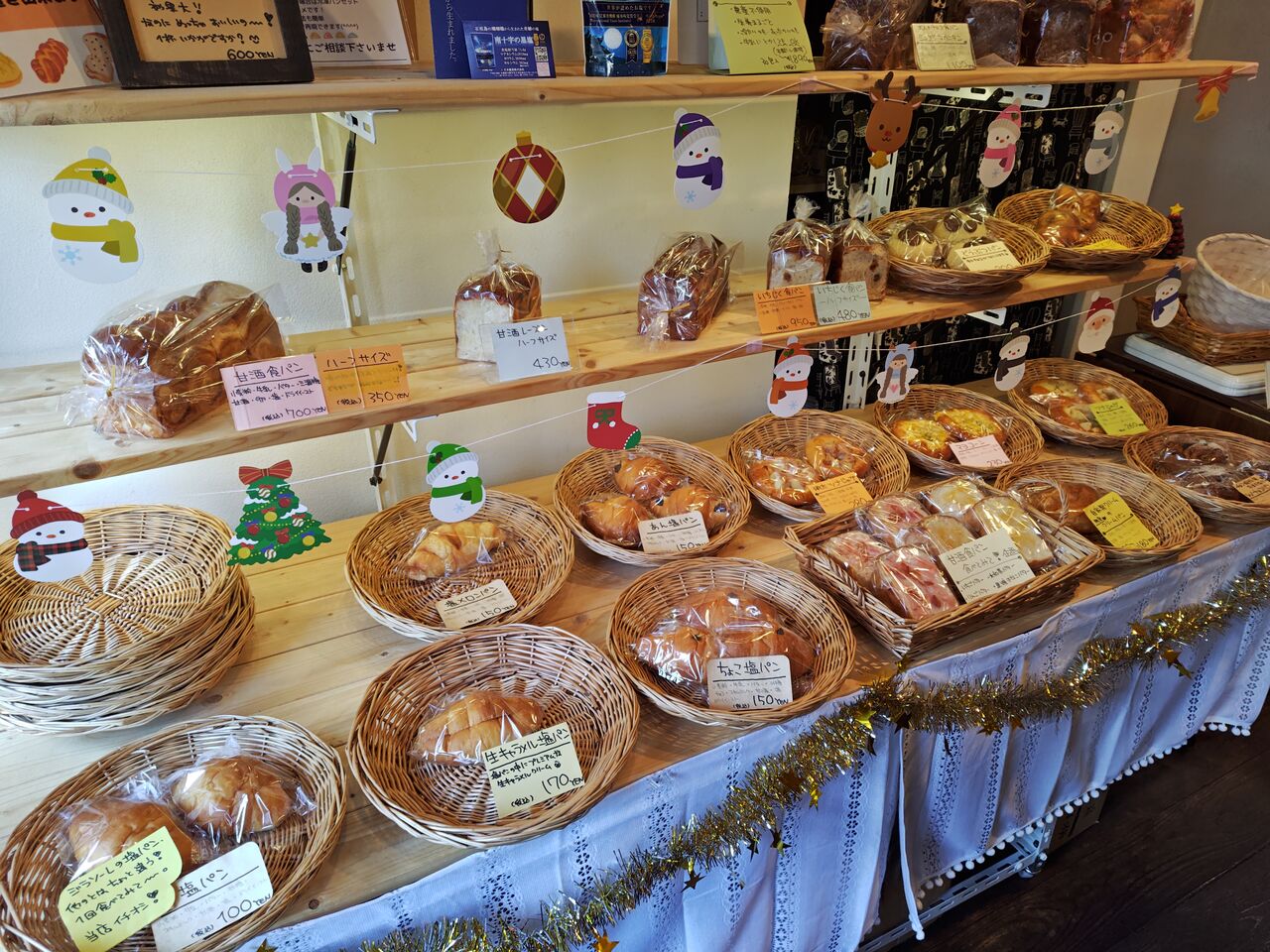 店内もかわいらしい雰囲気。まだクリスマス前に伺ったので、クリスマス仕様のディスプレーです(2025年12月20日訪問)。甘酒食パンは人気だから(と思われます)、ハーフサイズもあります。