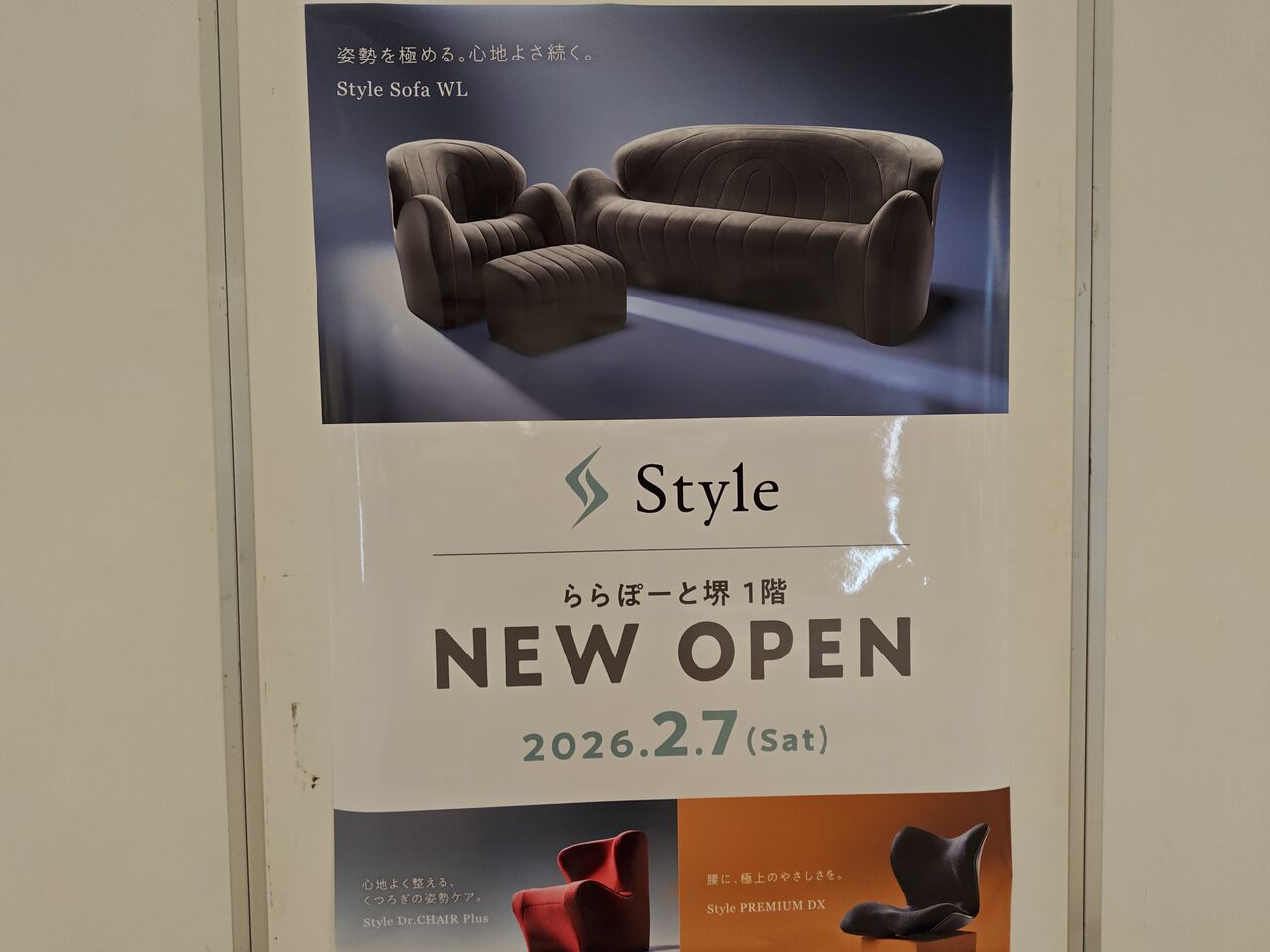 2026年2月7日、土曜日にオープンするのは「Style」さん。ポスターを見たところ、カウチなどの家具のお店かと思いきや、カイロプラクティックの視点で開発した“姿勢サポートブランド”だそうです。座るだけで姿勢が補正できたりする椅子を扱っているみたい。座っているときは、立っているときより腰に負担がかかっているんですって。意外。でも確かに、ずっと座ってPCを触っているだけでも腰が痛くなったりするし・・・。「Style」さんでは正しい姿勢で心地よく座れる椅子が販売されるようです。楽しみ。