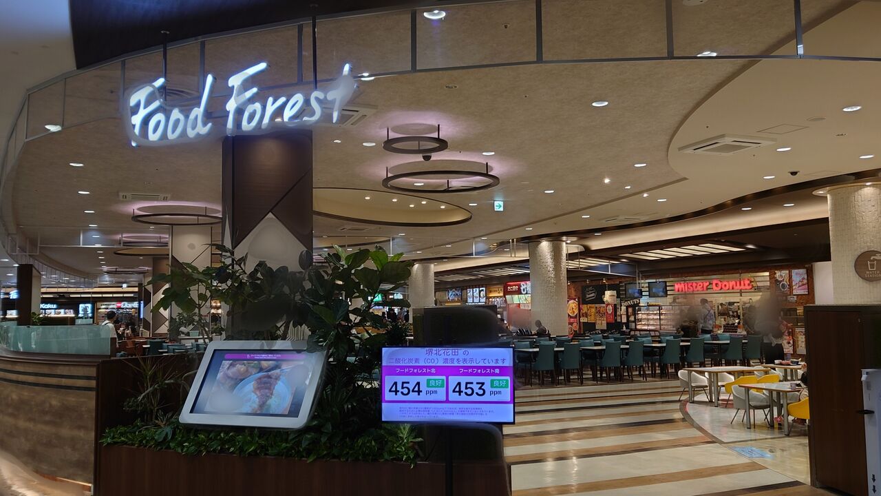 堺市北区のイオンモール堺北花田。船の舳先のような形が印象的。こちらの入口は、大阪メトロ御堂筋線北花田駅に一番近い入口です。ここから入るとずっとショッピングモールが続いていて、1階なら途中に大きめ店舗の「無印良品」が見え、さらに奥に進むと、突き当りが総合スーパーイオン堺北花田店です。巨大イオンモールです。そんなイオンモール堺北花田の3階にあるフードコート。