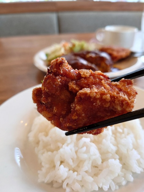 🍊【ランチ】チーズインハンバーグと唐揚げ金賞ナンバーワンそして平日は日替わりスープ飲んでよし