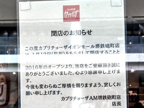 大阪は堺のイオンモール、衝撃!鉄砲町のカプリチョーザが閉店します