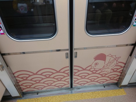 🍊【1/11】えべっさん帰りの恵美須町駅のお手洗いの壁の絵も素敵ならプラットフォームも車内のシートや床や扉もアートに溢れていた件